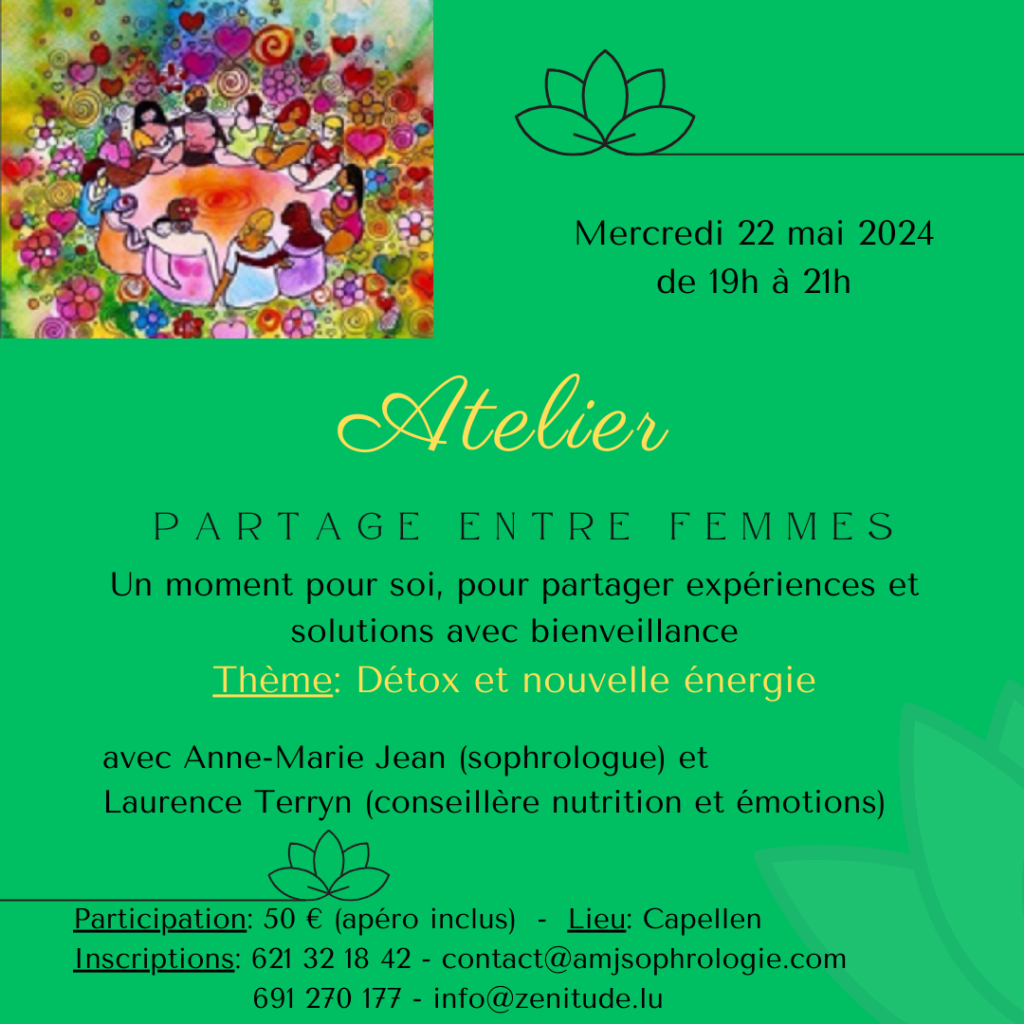 22 mai – Atelier Partage entre femmes: un moment en petit groupe pour partager idées sur le thème « détox et nouvelle énergie »